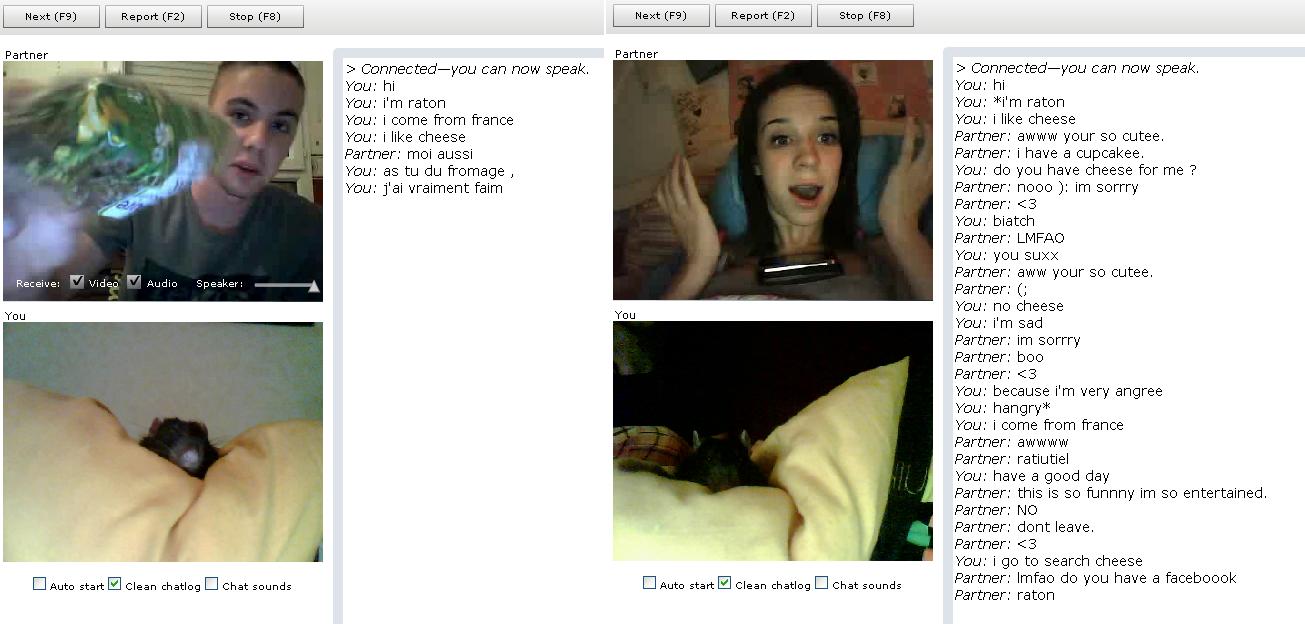 Hier soir avec une amie j'ai fait une session chatroulette peu ordinaire. En effet pour remplacer nos têtes à la webcam nous avons positionné Raton, notre rat juste devant l'objectif. Nous abordions les gens d'une façon simple : "Hi, I'm Raton ! I come from France and I like cheese !". Ensuite pour ajouter un peu de fun nous demandions à nos interlocuteurs s'ils avaient du fromage pour nous. La plupart des gens appuyaient sur le bouton Next mais certains ont eu des réactions assez drôle.